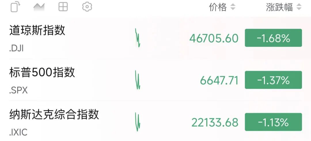 美股三大股指全线大跌。
